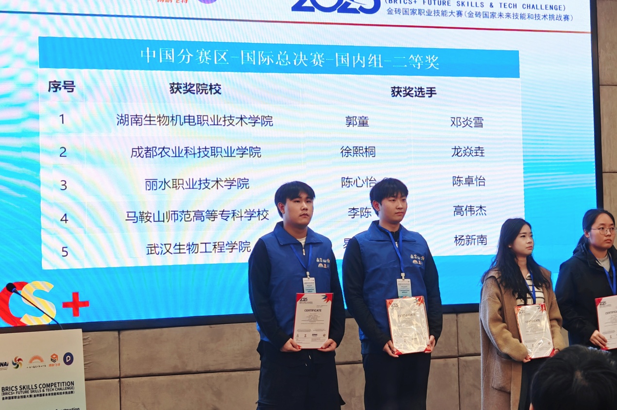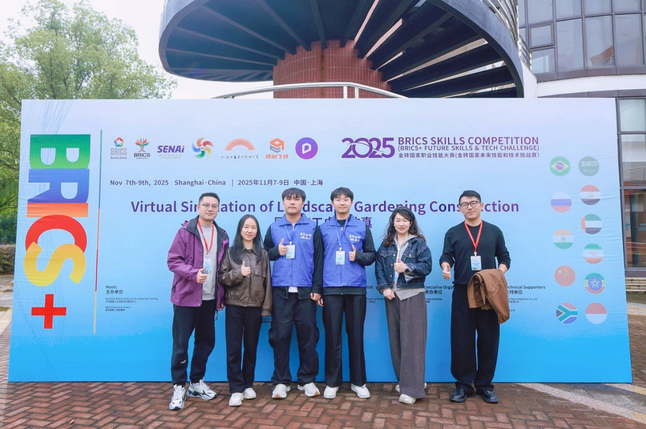 11月9日, 2025年金砖国家技能大赛园艺施工虚拟仿真赛项国际总决赛赛项在上海工艺美术职业学院圆满落幕。艺术设计学院学子李陈、高伟杰组成的参赛队伍,在指导老师沈婷、谢静的悉心指导下,凭借扎实的专业功底与默契的团队协作,从众多参赛队伍中脱颖而出,最终斩获赛事二等奖。