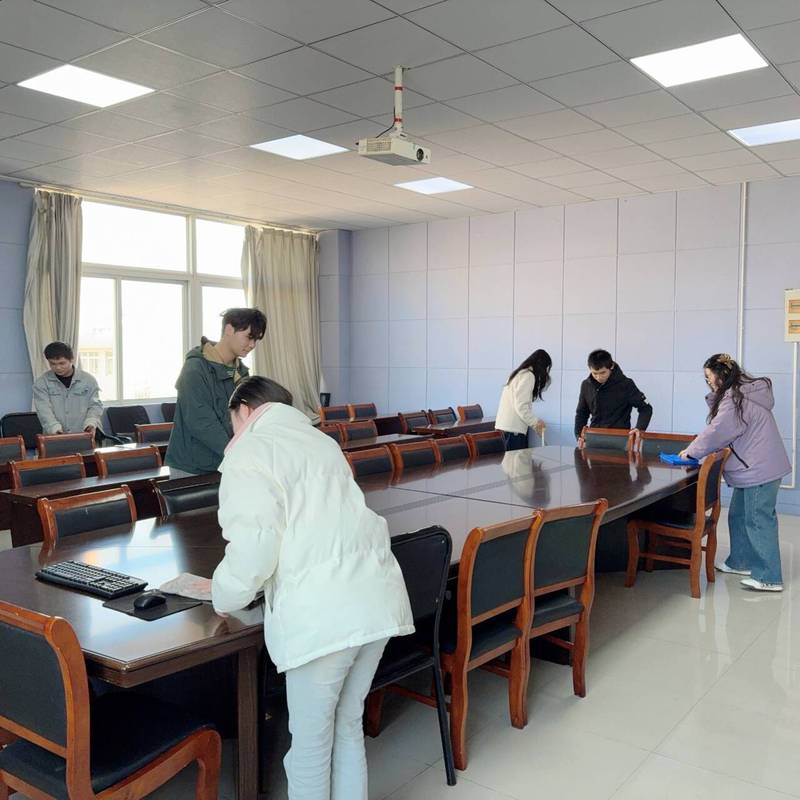 劳动现场一派热火朝天的景象,志愿者们充分展现了不怕脏、不怕累、不怕苦的优良作风,分工协作、默契配合完成各项任务。有的手持扫帚对地面杂物进行全面清扫,细致清理垃圾;有的拿着抹布认真擦拭桌面,确保不留灰尘死角;有的专注于拖地,确保地面无灰尘。面对墙角、地面的顽固污渍,大家主动清理,确保不放过任何一处卫生盲区。阳光映照下,他们忙碌的身影成为校园里一道亮丽的风景线,汗水浸湿了衣衫,却让“为人民服务”的信念更加坚定。