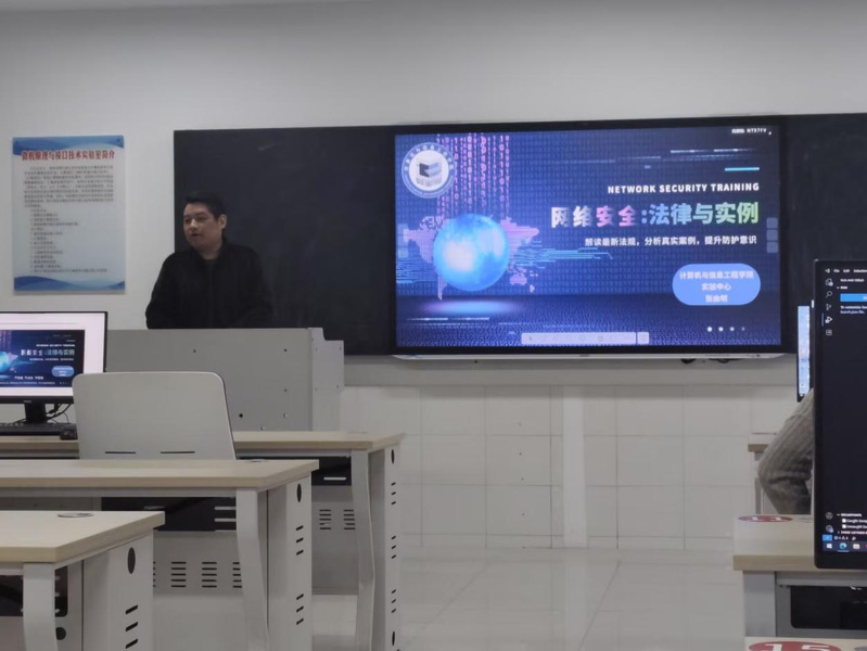 为提升学生网络安全意识,防范网络风险,计算机与信息工程学院实验中心组织开展了以“网络安全:法律与实例”为主题的网络安全宣讲活动。本次活动围绕《网络安全法》最新修订内容、实名制管理、AI安全威胁及真实案例解析等方面展开系统讲解。