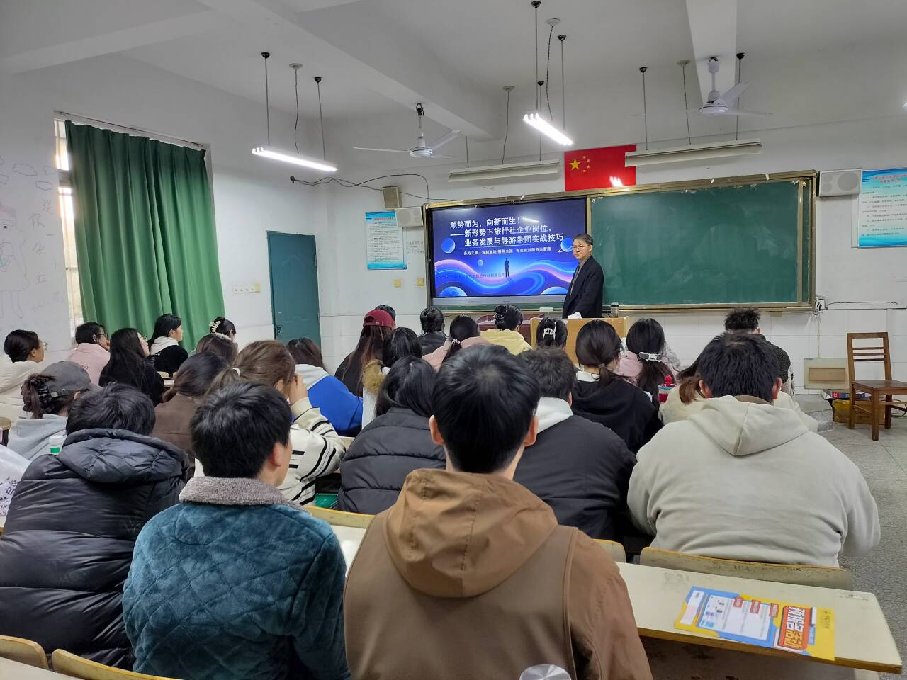2025年12月9日,东方之旅旅行社总经理陈王磊莅临BB贝博艾弗森官网经济与管理学院精业楼205教室,为23级旅游管理专业及研学旅行管理与服务专业的学生带来了一场主题为“顺势而为,向新而生——新形势下旅行社业务发展、导游带团实战技巧与企业岗位”的精彩讲座。讲座聚焦文旅行业新趋势、实战技能与职业发展,为师生们提供了宝贵的行业洞察与实践指导。