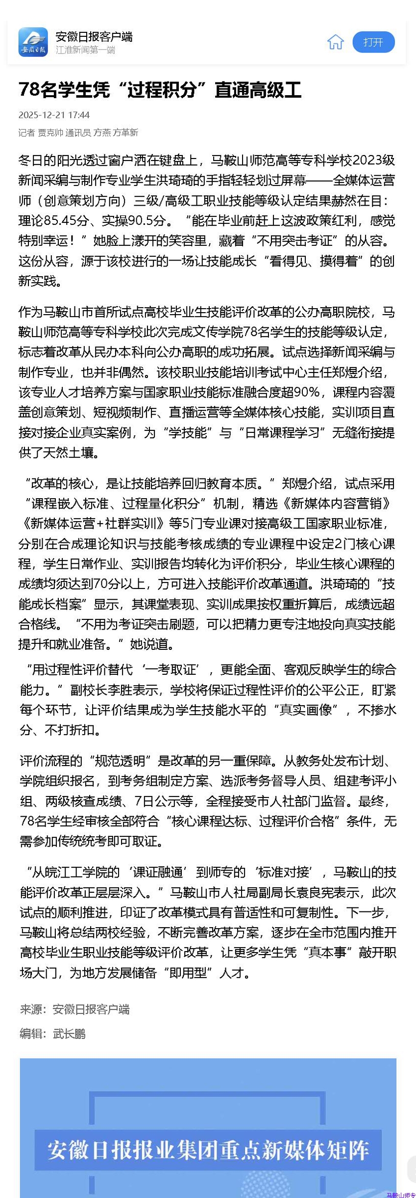 “从皖江工学院的‘课证融通’到师专的‘标准对接’,马鞍山的技能评价改革正层层深入。”马鞍山市人社局副局长袁良宪表示,此次试点的顺利推进,印证了改革模式具有普适性和可复制性。下一步,马鞍山将总结两校经验,不断完善改革方案,逐步在全市范围内推开高校毕业生职业技能等级评价改革,让更多学生凭“真本事”敲开职场大门,为地方发展储备“即用型”人才。(来源/安徽日报客户端 一审/洪琦琦 二审/黄凌骜 三审/丁永华)